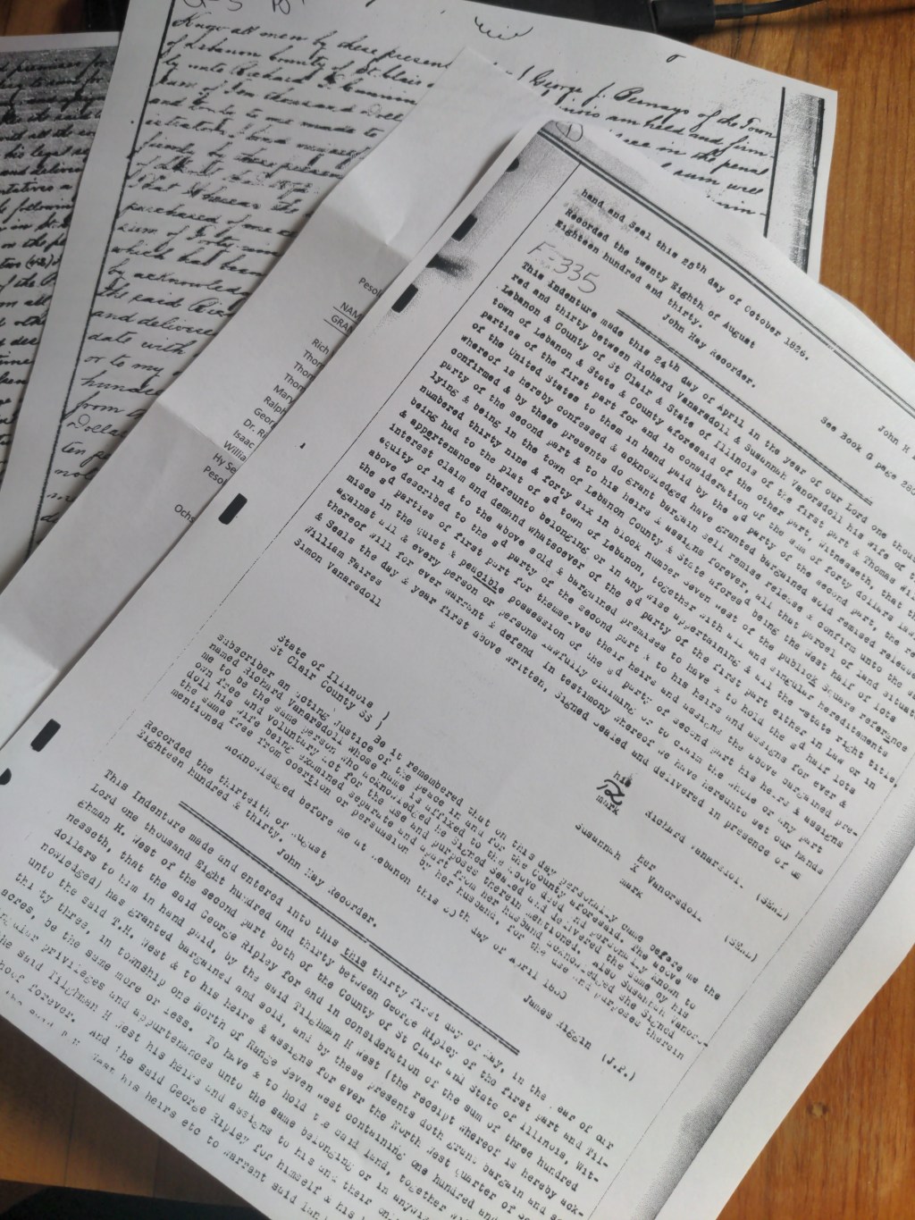 After several trips to the St. Clair County Courthouse along with a couple trips to Carbondale – we found the first sale of the land recorded. Simon and Susannah Vanorsdal (spelling varies) sold the property described as blocks numbered 39 to 46 in block number 7 west of the public square in Lebanon. The land was purchased by Thomas Williams, ESQ. and Mary (Vanorsdal) Williams on 24 April, 1830. The deed was completed by one James Riggin J.P. (Justice of the Peace), and John Hay, Recorder. We believe this is where the misconception of James Riggin being listed as the builder of this grand old house started.